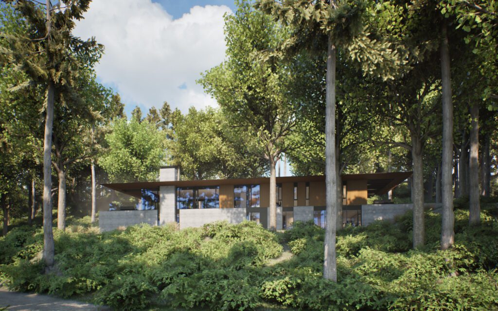 Set within a wooded hillside, the house unfolds as a series of horizontal volumes extending into the landscape. Stone, wood, and glass form a restrained material palette, while finely articulated roof planes create deep overhangs that shelter outdoor spaces and establish a quiet connection to the forest.