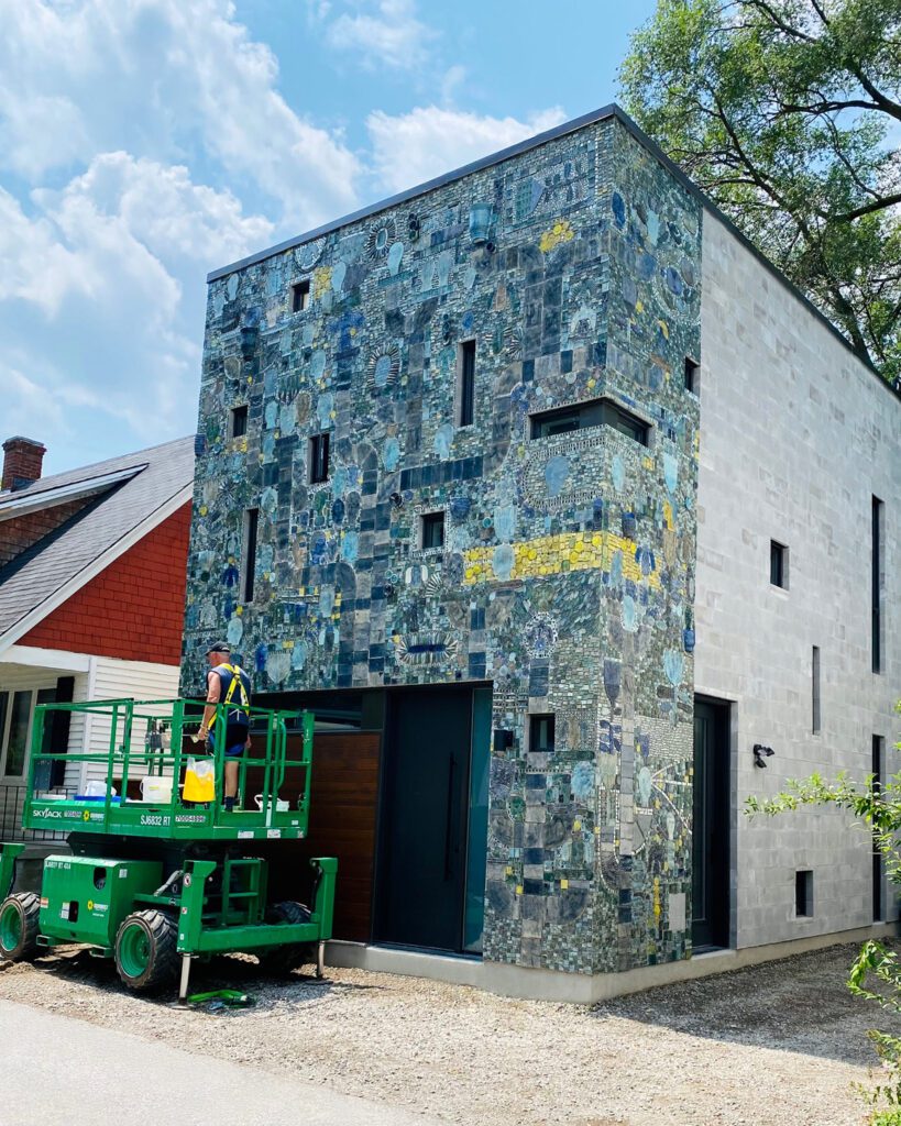 The owners saw potential on a small lot with a condemned house. A well-articulated, two-story, 700 sq ft footprint would replace a larger suburban home and commute. Day’s desire to create a mosaic tile installation on the home’s façade was fundamental to the building’s architecture. The simple form, 18 ft wide by 36 ft deep, allows for economical construction. The building is a palette for art; a simple base to allow the artist’s ceramic work to flow along the east and north facing walls. Architecture and art form a symbiosis in their dual roles, creating a plasticity in the interplay between one and the other. Concrete block serves as an ideal subsurface for the application of mosaic tiles. The ceramic colours and design transforms the overall structure making it light and lyrical.